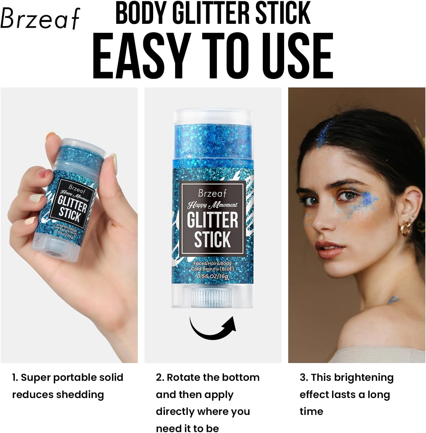 【Wide Range of Applications】Our blue glitter stick makeup can be used in many applications. For example, music festivals, concerts, birthday parties, stage performances, holiday events and various other occasions. You can in use glitter cream to decorate your face, hair, body, eye shadow and other various parts. Let your makeup shine all over, let the pearlescent illusion hold your beauty.
