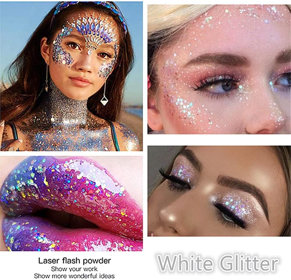 【Clear White Face Body Glitter Holographic Effect】This Clear Body Glitter Gel can blend easily to all other colors glitter.1989 Singer Concerts Face Body Chunky Glitter Blends with plenty of different shapes and sizes of chunky and fine glitters in a gel base,great for a metallic coverage wtih a holographic effect.The mermaid sequin glitters have vibrant color,which shows up as a rainbow highlights and shiny sparking shimmer smear.Attention:It is clear white glitter gel,great for Halloween glitter SFX makeup.You will love it for all glitter foundation with this white one.