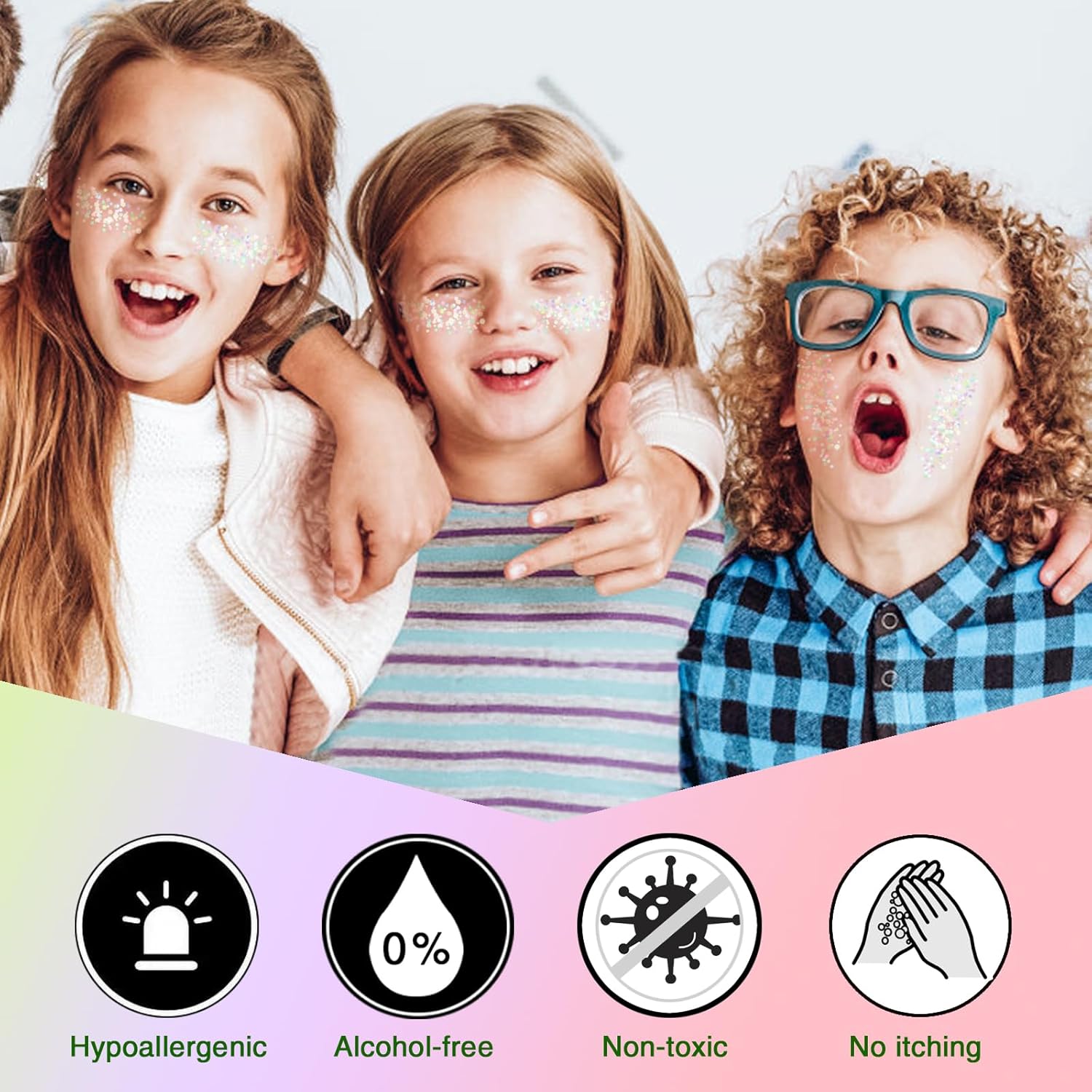 Experience the ultimate blend of safety and sparkle with our hypoallergenic glitter gel, specially formulated for sensitive skin and kids. Free from harsh chemicals and adhesives, it glides smoothly onto hair, face, or body without irritation, delivering instant shimmer that lasts.