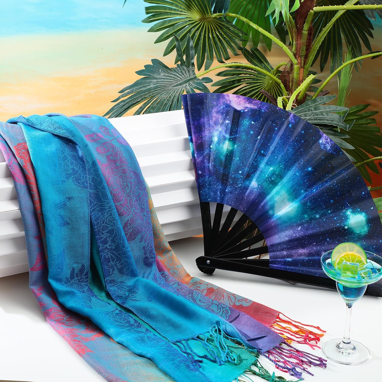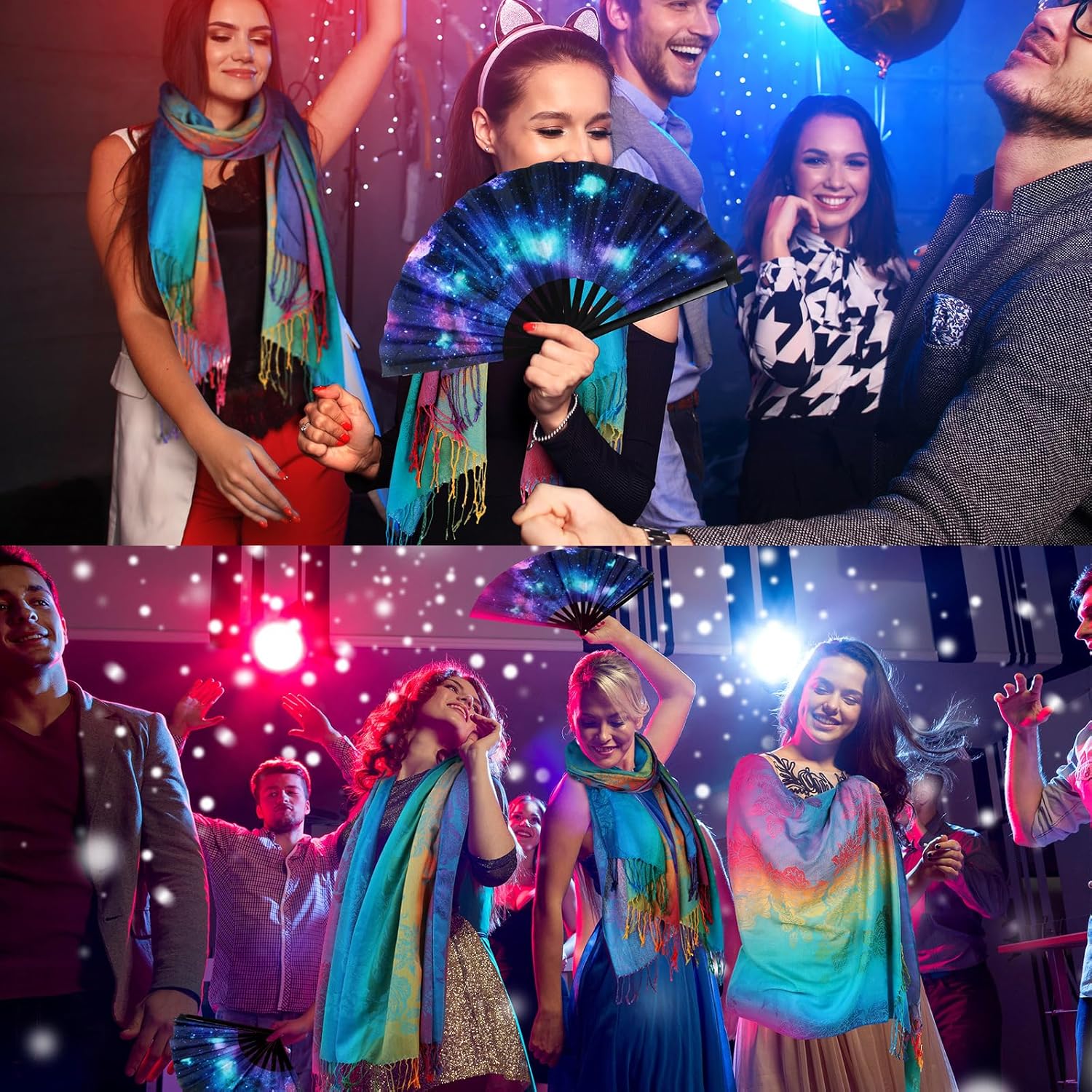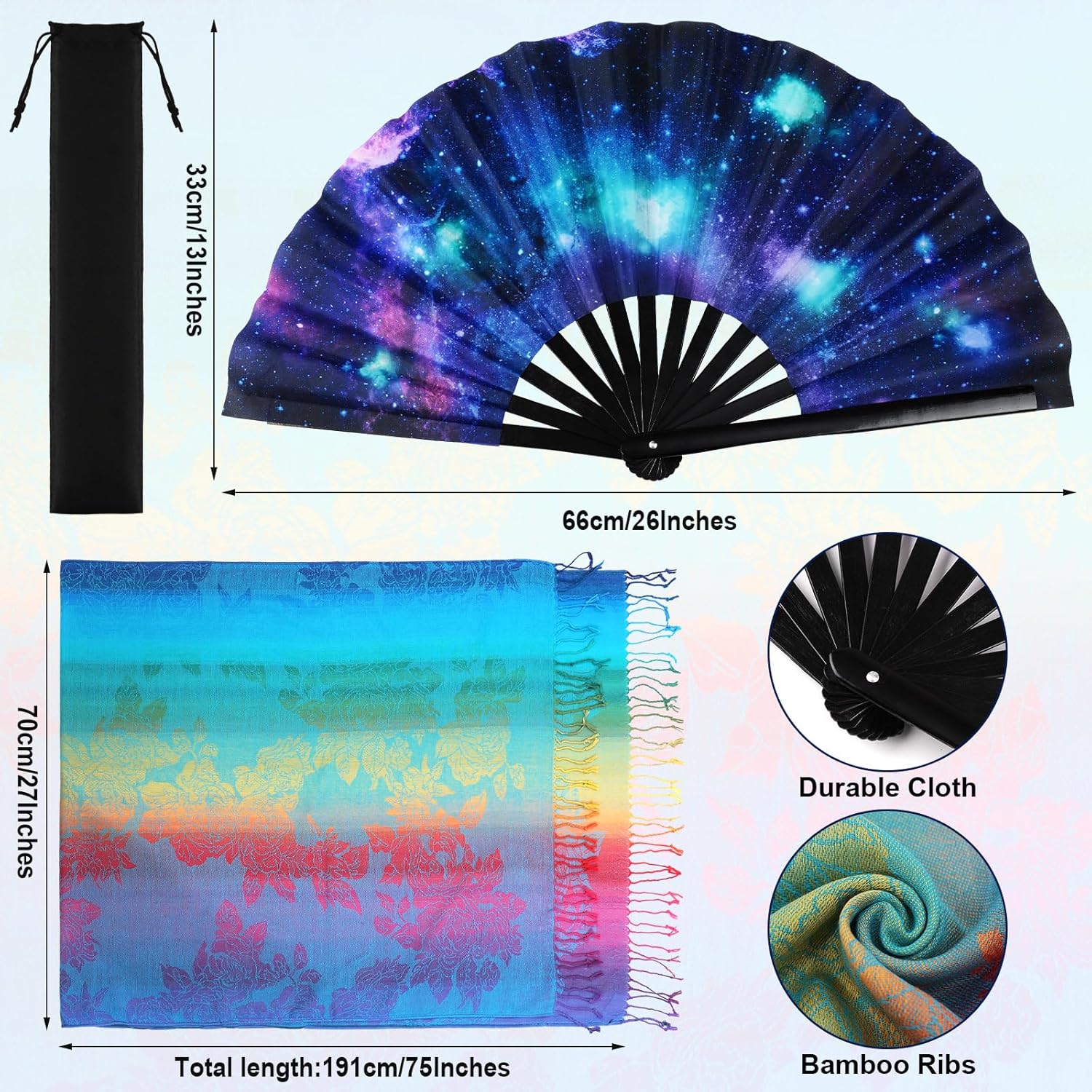 Qunclay 2 Pcs UV Glow Large Rave Hand Fan Jacquard Scarf Shawl Pashmina for Women Party Dance on Festivals
