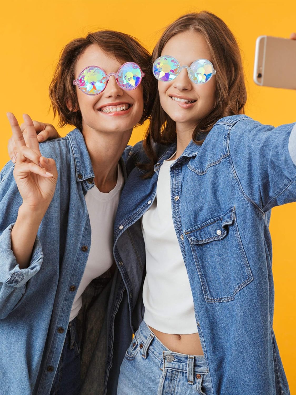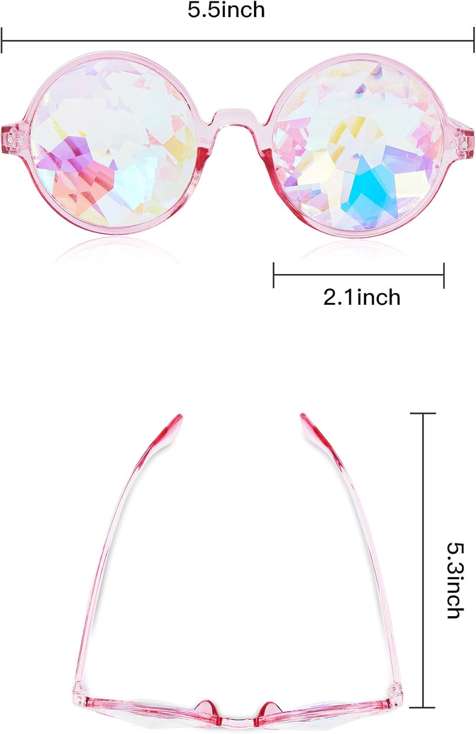 Customers find these kaleidoscope glasses perfect for raves, with vibrant rainbow lenses creating mesmerizing patterns that match well with festival outfits. The glasses receive mixed feedback regarding durability, with some saying they’re well-made while others report them breaking easily, and visual quality, with some customers unable to see through them at all. Customers consider them good value for money, though they note they fall off easily and are heavy on the face.